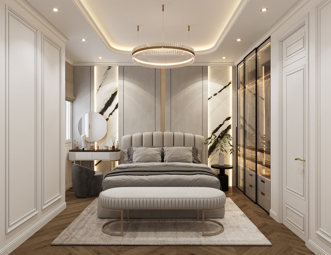 Thiết kế nội thất phòng ngủ master được thiết kế đơn giản nhưng có đầy đủ các công năng, giường ngủ được bố trí ở vị trí trung tâm. Ánh sáng chính là điểm nhấn đặc biệt để mang đến sự hứng khởi, sự tươi mới cho không gian. Các thiết kế phòng ngủ khách như phòng ngủ trẻ em, phòng ngủ phụ cũng được chú ý đến từng các chi tiết nhỏ, vách ngăn, hoa văn có tự trang trí đơn giản hay sự kết hợp tinh tế bởi hệ thống tử kệ giúp mang đến sự tiện nghi và tinh tế trong từng chi tiết. Màu sắc cũng được thay đổi qua từng không gian theo đúng độ tuổi, tính cách của các thành viên nhưng vẫn giữ được sự tối giản, đồng nhất trong không gian.